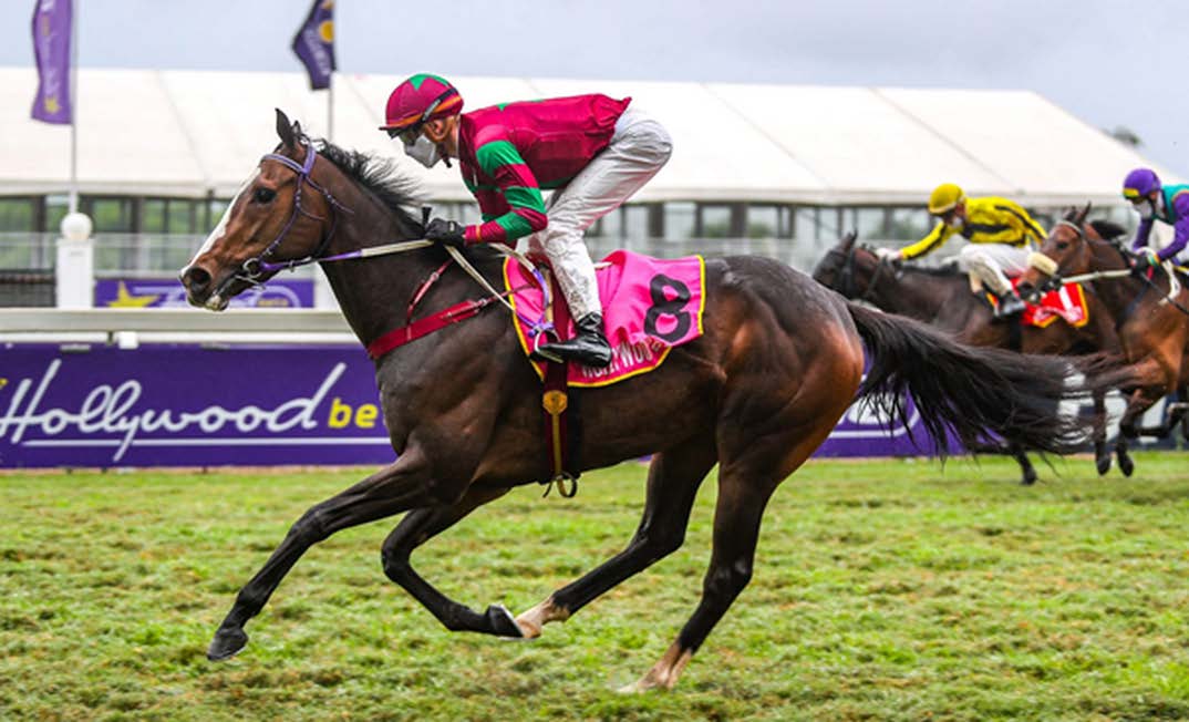 Featured image of PINCH ME, a filly by Gimmethegreenlight, winning her race for international owners from Ireland. Photo by Candiese Lenferna